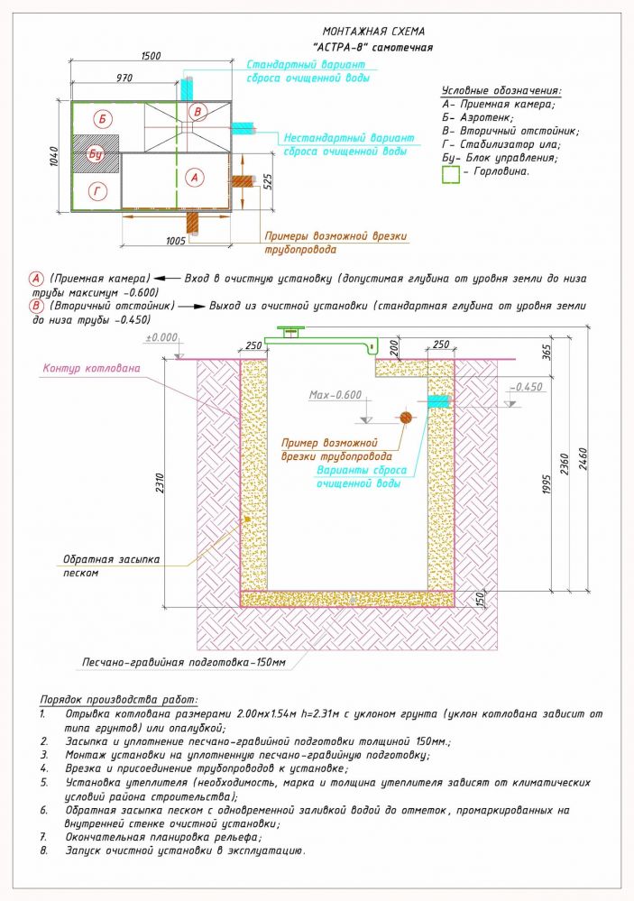 Возможности применения и установки септика Астра 8 в зависимости от количества проживающих, объема залпового сброса, суточной переработки и количества санузлов.